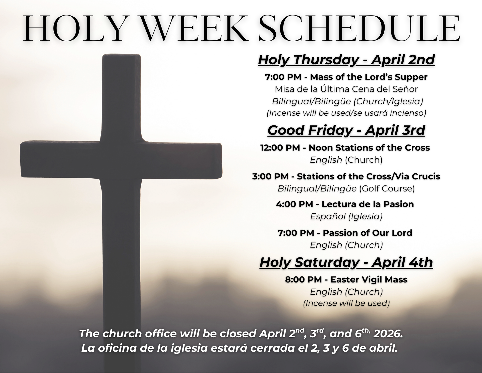 Wednesday – Friday Masses are held at the church on Bethel Road.